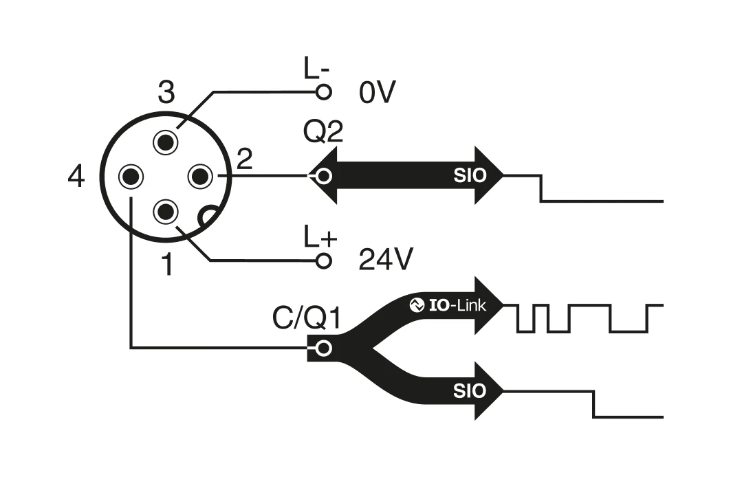 OSS1(输出 1)与 4 号引脚/导线相连。与 IO-Link 主设备连接时,可用作 IO-Link 引脚